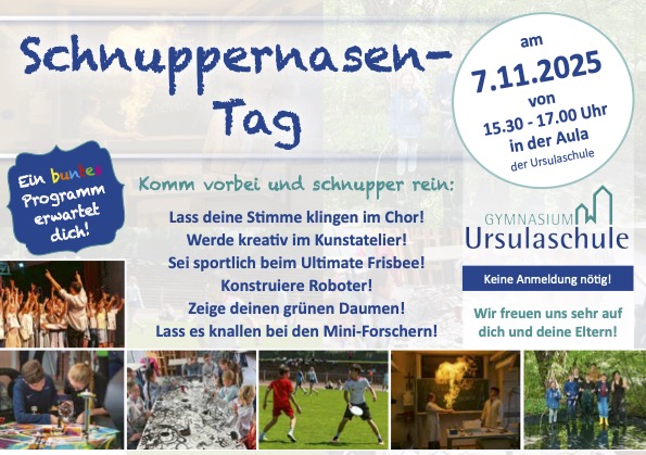 Am Freitag, dem 07.11.2025 laden wir ab 15:30 Uhr alle Kinder der 4. Klassen mit ihren Eltern zu unserem "Schnuppernasentag" ein. Lernt dort einige unserer spannenden AGs kennen und schnuppert bei uns rein!