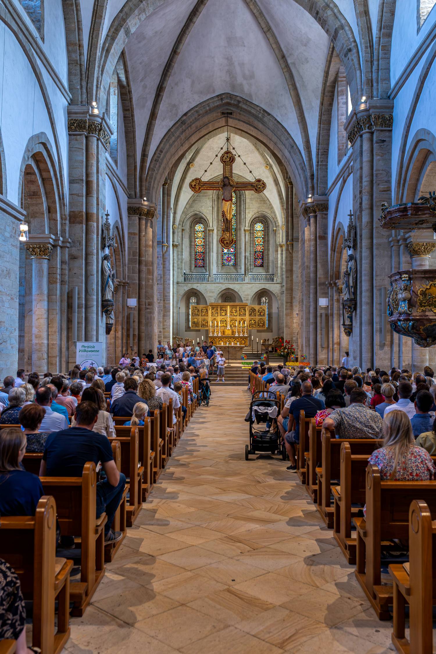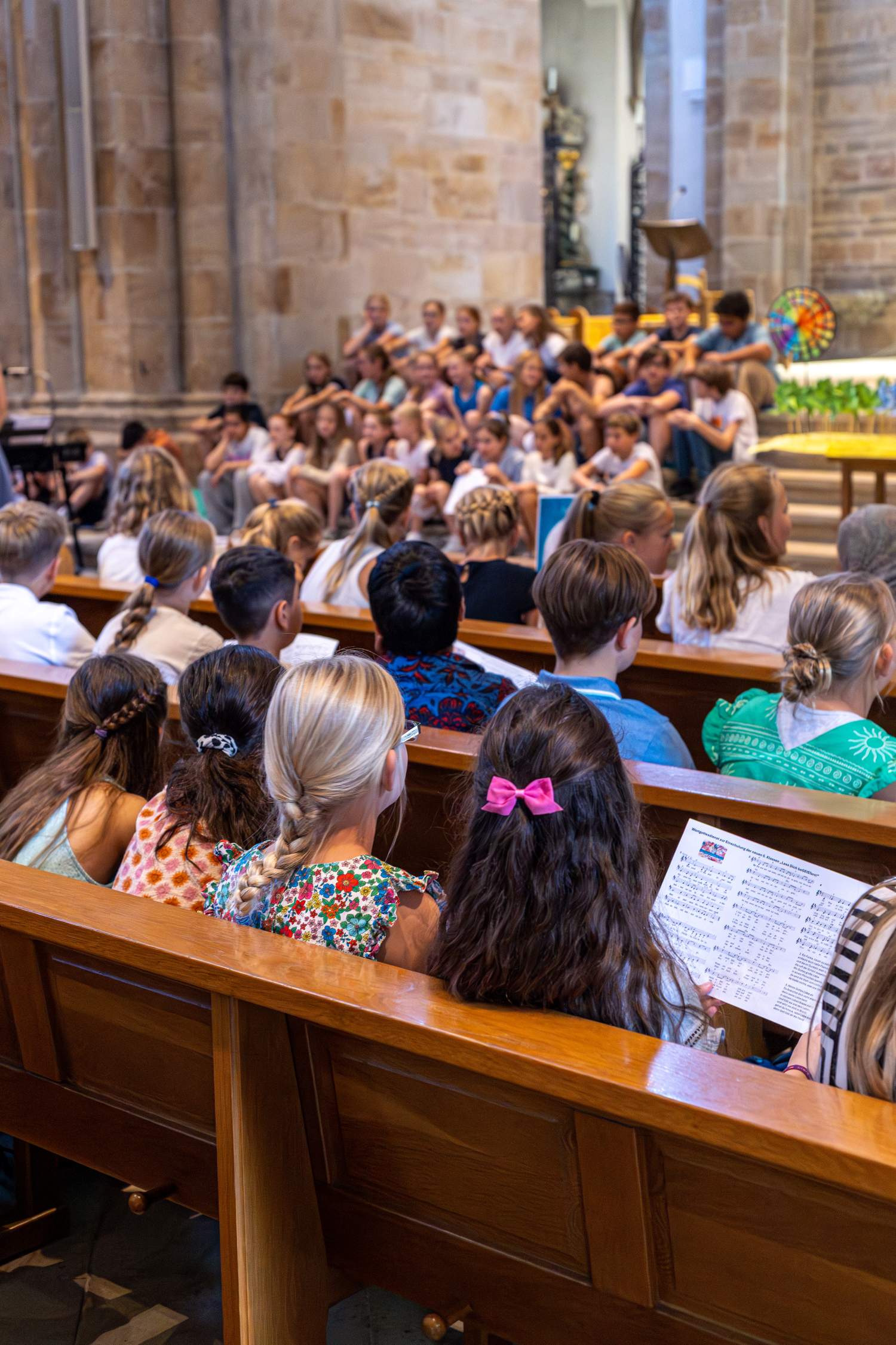 Zum Abschluss feierten Eltern, Schülerinnen, Schüler und Lehrkräfte gemeinsam einen großen Einschulungsgottesdienst. Dort erhielten die Kinder symbolisch ein Windrad von ihren Klassenlehrerteams – als Zeichen für Schwung, Freude und Rückenwind auf ihrem Weg. Jedes Kind bekam zudem einen Wunschspruch mit auf den Weg, der in einem Satz das Motto des neuen Schuljahres zusammenfasste: „Lass dich begeistern: Gott schenkt dir Rückenwind!“