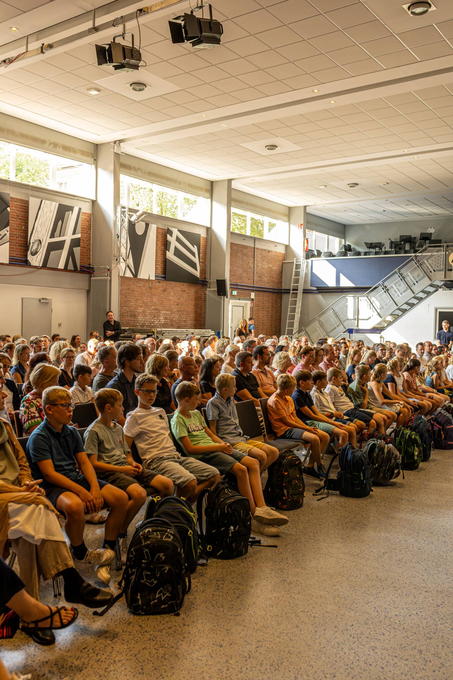 Unter dem Schuljahresmotto „Lass dich begeistern!“ begrüßte Schulleiterin Frau Boßmeyer-Hoffmann die Kinder und ihre Familien. Sie knüpfte dabei an die beeindruckenden Blitze am Abendhimmel zuvor an: Ein Bild dafür, dass wir alle, so verschieden wir auch sind, unter demselben Himmel leben, lachen und lernen.