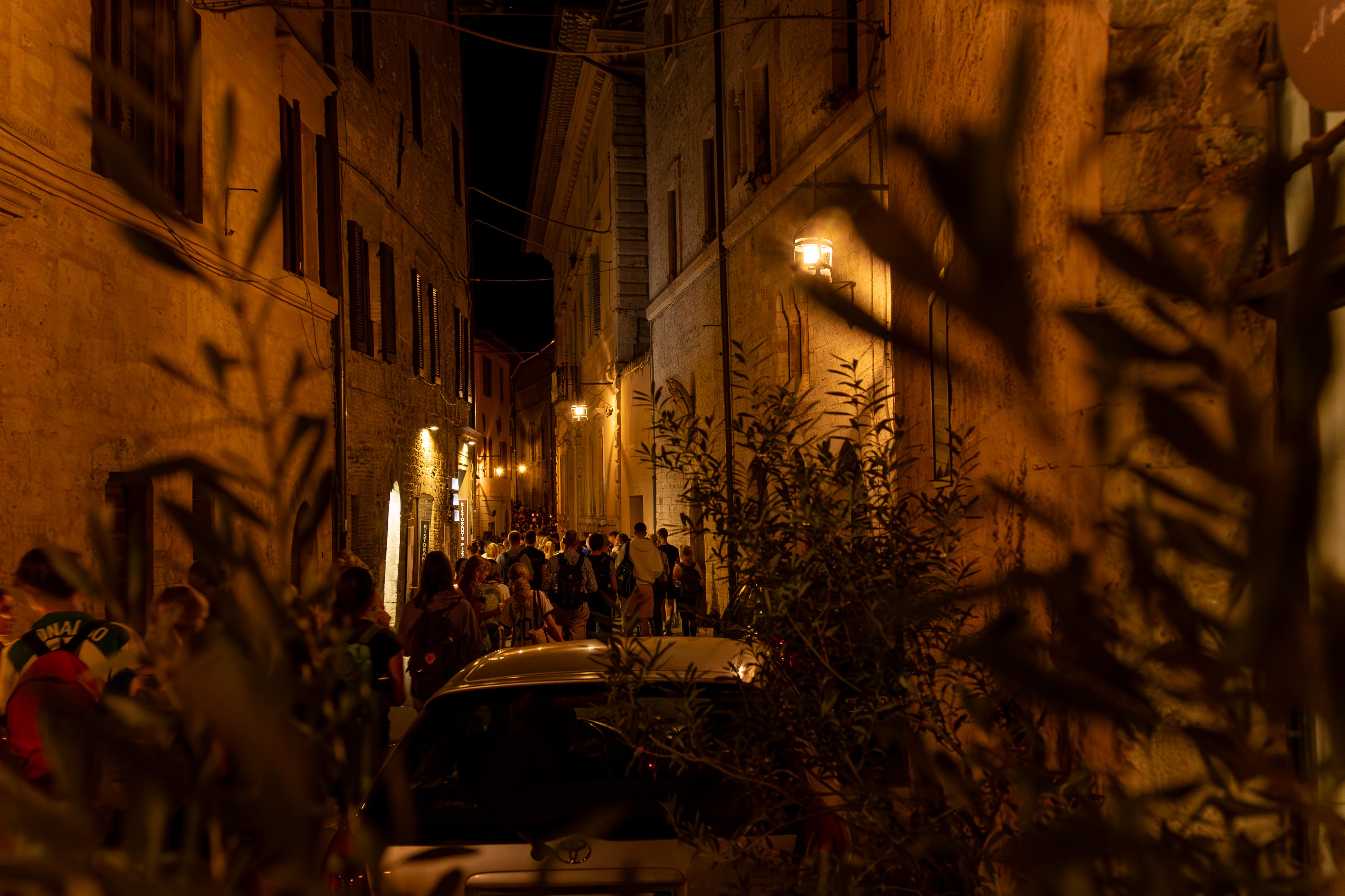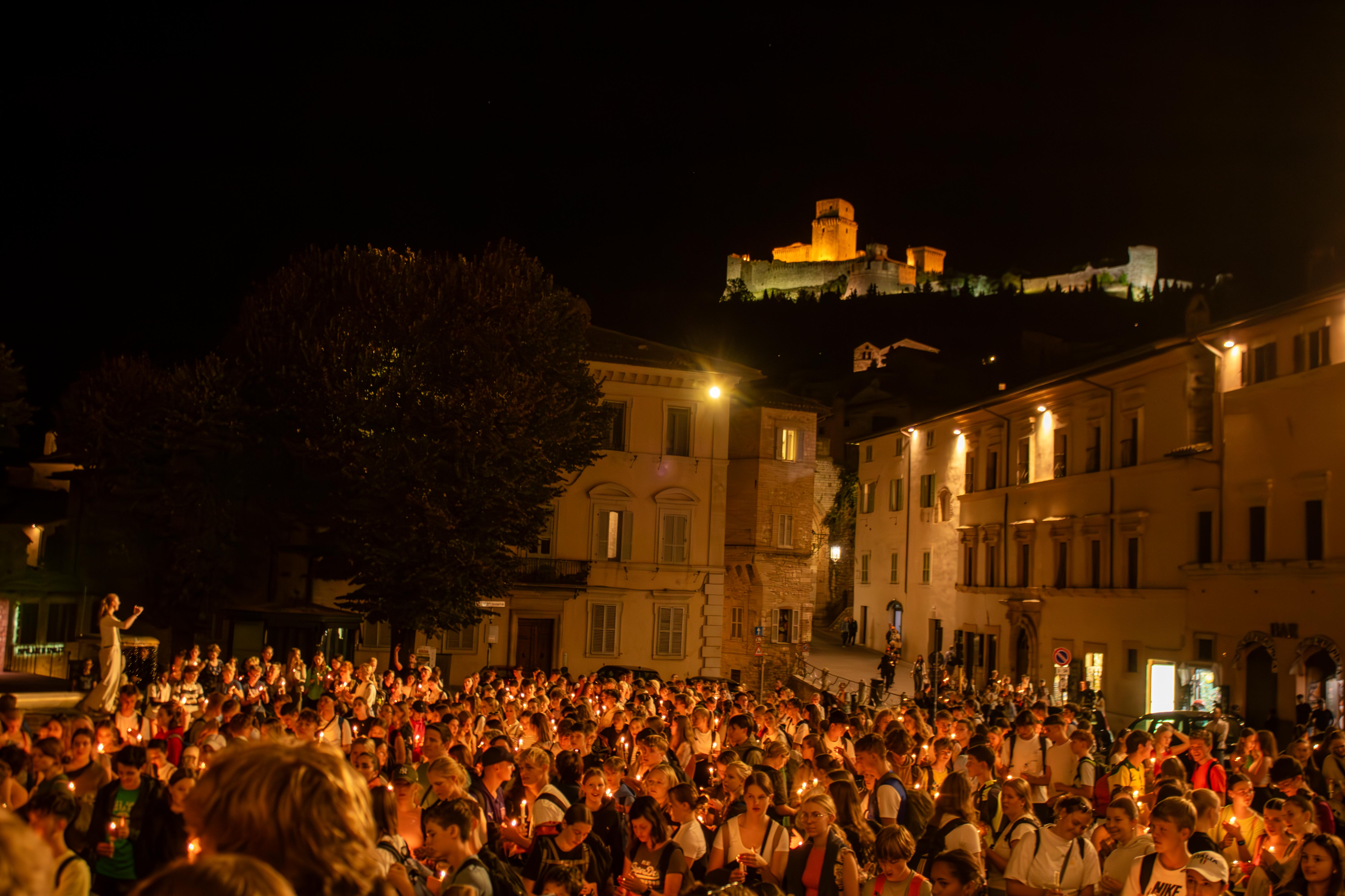 Geschafft, aber glücklich fanden sich gegen 18 Uhr alle Gruppen in der Oberkirche von San Francesco ein, um gemeinsam einen letzten Gottesdienst im Zeichen des Franziskus zu feiern. Zwischen den Fresken Giottos zu Leben und zur Legende des Heiligen fanden wir unter Leitung des ehemaligen Generalvikars Theo Paul zur Ruhe, sangen und beteten miteinander. Einmal mehr stellten wir Friedenswünsche ins Zentrum unserer Gedanken. Im Anschluss zogen wir vor beindruckender Kulisse und unter guten Grüßen der Passanten durch das nächtliche Assisi. Am Ende versammelten wir uns auf dem Vorplatz von Santa Chiara und sangen gemeinsam mit unserem Chor. Auch hier schlossen sich vorbeigehende Menschen uns in Begeisterung an. Mit unseren Kerzenlichtern wollten wir unserem Motto „Frieden! Zusammen aufbrechen“ auch einen sicht- und erlebbaren Ausdruck verleihen.