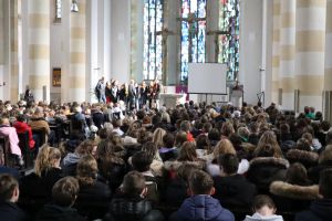 Und noch etwas zum Thema „Gemeinschaft“: Wir sind – und das wisst Ihr bestimmt schon – eine Schule, die zum Bistum Osnabrück gehört. Bei uns gibt es immer mal wieder Gottesdienste – für einzelne Klassen und Jahrgangsstufen, manchmal auch für die gesamte Schule. Und was auch sehr schön ist: Wir beginnen in den Klassenräumen den Tag mit einem gemeinsamen Morgenimpuls. Wir leben auch den Trialog der Religionen. In unserer Schule gibt es nicht nur den christlichen Religionsunterricht, sondern auch islamischen und jüdischen.
